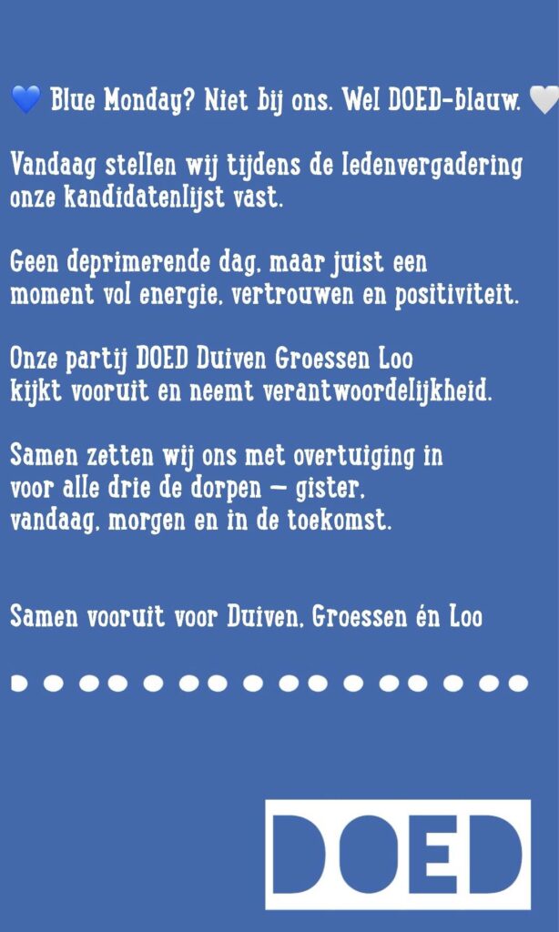- DOED staat voor het op een positieve en gelijkwaardige wijze behartigen van belangen van de inwoners van de Gemeente Duiven.