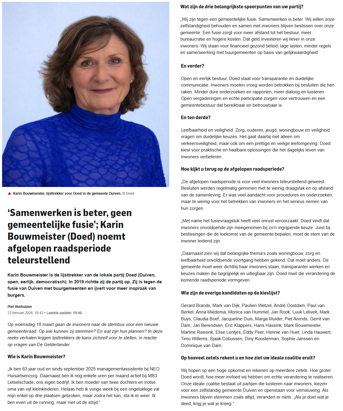 DOED is tegen een gemeentelijke fusie. Samenwerken is beter. Wij willen onze zelfstandigheid behouden en samen met inwoners blijven...